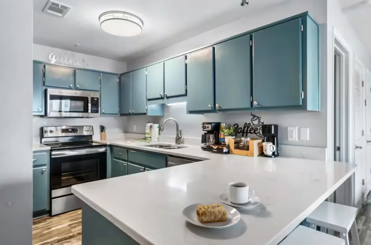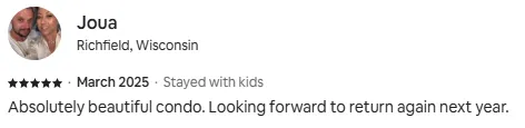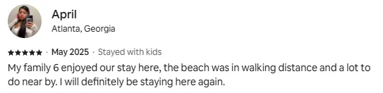 I LOVED LOVED my stay ! It was such a beautiful home . Beds were super comfortable, we had everything we needed. Just a spectacular place ! It was so clean and spacious! My son loved running around the place lol we loved the balcony too ! It was a great view. Beach wasn’t far like 2-3 minute walk . Everything was just great ! The pool was great too ! When I say I loved this place I did ! Out of all the air bnbs that I’ve stayed at this is the BEST one. I will definitely be back 💕