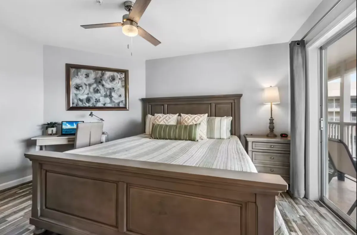 Master Bedrooms #1 - King Bed - 42" Smart TV - Dresser - Covered Balcony - Desk - Ceiling Fan - Connected to the full bathroom - Standup shower - Single vanity sink- walk-in closet