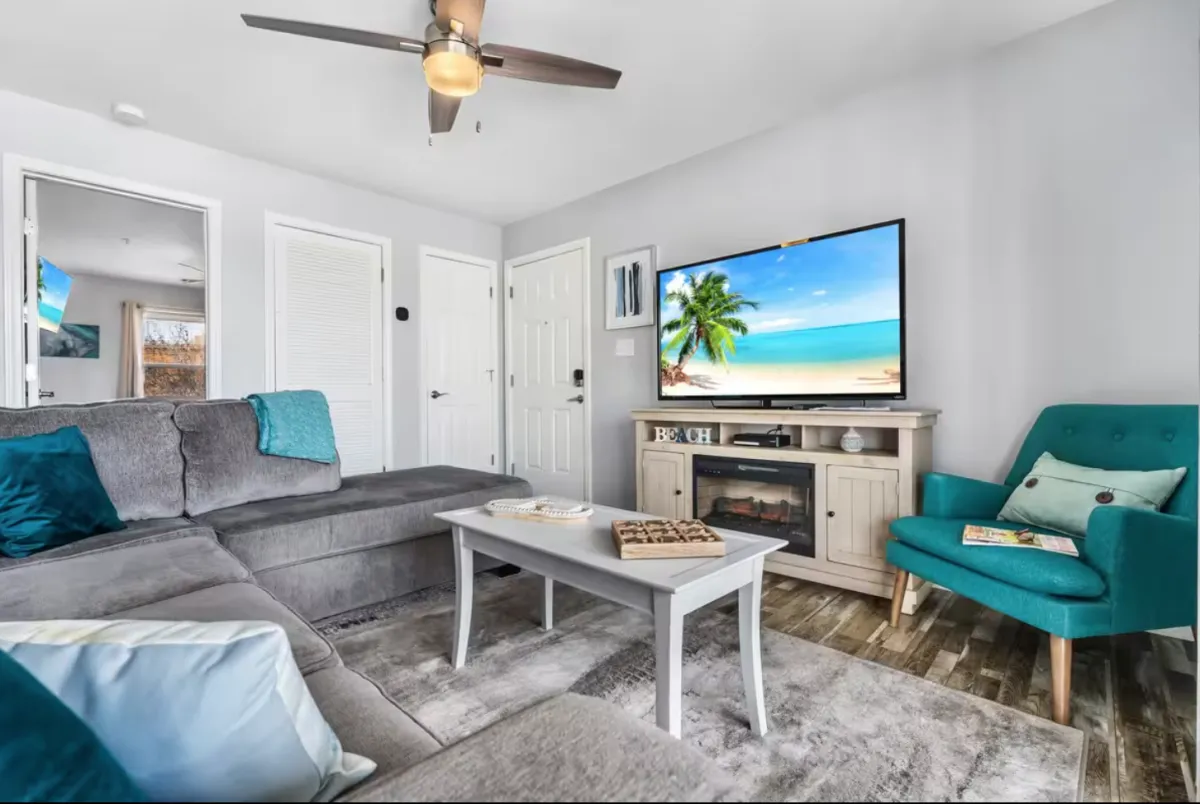 Comfortable Living Room - Queen Sofa Sleeper - 60" SmartTV with Cable - Opens to an outdoor covered balcony with seating that looks out to the swimming pool.