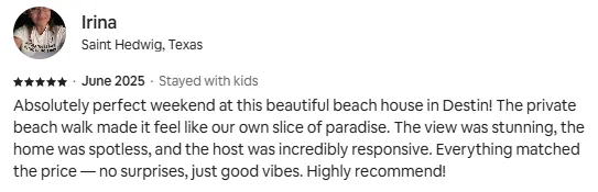 Absolutely perfect weekend at this beautiful beach house in Destin! The private beach walk made it feel like our own slice of paradise. The view was stunning, the home was spotless, and the host was incredibly responsive. Everything matched the price — no surprises, just good vibes. Highly recommend!
